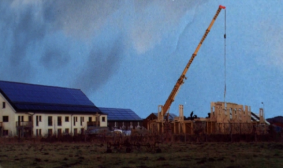 häusern in Niedrigenergiebauweise. 5 Häuser bestehen aus Holzrahmen- konstruktionen, die wie Fertighäuser in nur wenigen Tagen errichtet wurden. Die Bauteile wurden in Finnland hergestellt und aufbaufertig geliefert. Das Holz kommt aus kleinen eigenständigen Sägemühlen. Die akkurate Passform der Gebäudeteile macht die Gebäudehülle absolut winddicht. Zur Wärmedämmung der Häuser wurde Altpapier verwendet, so dass zusammen mit den dreifach- verglasten Fenstern ein besonders niedriger U-Wert (Maß des Wärmedämm- vermögens) erreicht werden konnte. Alle verwendeten Materialien wurden sorgsam auf ihre Umweltverträglichkeit geprüft. Der hohe Wärmedämmstandard und die Holzbauweise garantieren zu jeder Jahreszeit wohltemperierte Häuser mit angenehmem Raumklima. |
